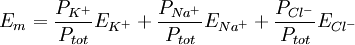 So in a resting membrane, while the driving force for potassium is low, its permeability is very high. Sodium has a huge driving force, but almost no resting permeability. In this case, the math tells us that potassium carries about 20 times more current than sodium, and thus has 20 times more influence over Em than does sodium. However, consider another case—the peak of the action potential. Here permeability to Na is high and K permeability is relatively low. Thus the membrane moves to near ENa and far from EK. The more ions are permeant, the more complicated it becomes to predict the membrane potential. However, this can be done using the Goldman-Hodgkin-Katz equation or the weighted means equation. By simply plugging in the concentration gradients and the permeabilities of the ions at any instant in time, one can determine the membrane potential at that moment. What the GHK equations says, basically, is that at any time, the value of the membrane potential will be a weighted average of the equilibrium potentials of all permeant ions. The "weighting" is the ions relative permeability across the membrane. Effects and implicationsWhile cells expend energy to transport ions and establish a transmembrane potential, they use this potential in turn to transport other ions and metabolites such as sugar. The transmembrane potential of the mitochondria drives the production of ATP, which is the common currency of biological energy. Cells may draw on the energy they store in the resting potential to drive action potentials or other forms of excitation. These changes in the membrane potential enable communication with other cells (as with action potentials) or initiate changes inside the cell, which happens in an egg when it is fertilized by a sperm. In neuronal cells, an action potential begins with a rush of sodium ions into the cell through sodium channels, resulting in depolarization, while recovery involves an outward rush of potassium through potassium channels. Both these fluxes occur by passive diffusion. See also