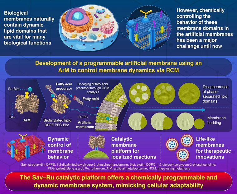 Utilizando a química catalítica, os investigadores do Instituto de Ciências de Tóquio conseguiram um controlo dinâmico das membranas artificiais, permitindo um comportamento de membrana semelhante ao da vida. Ao utilizar uma metaloenzima artificial que realiza uma reação de metátese de fecho de anel, a equipa induziu o desaparecimento de domínios separados por fases, bem como a divisão de membranas em membranas artificiais, imitando o comportamento dinâmico das membranas biológicas naturais. Esta investigação transformadora constitui um marco nas tecnologias de células sintéticas, abrindo caminho para avanços terapêuticos inovadores.